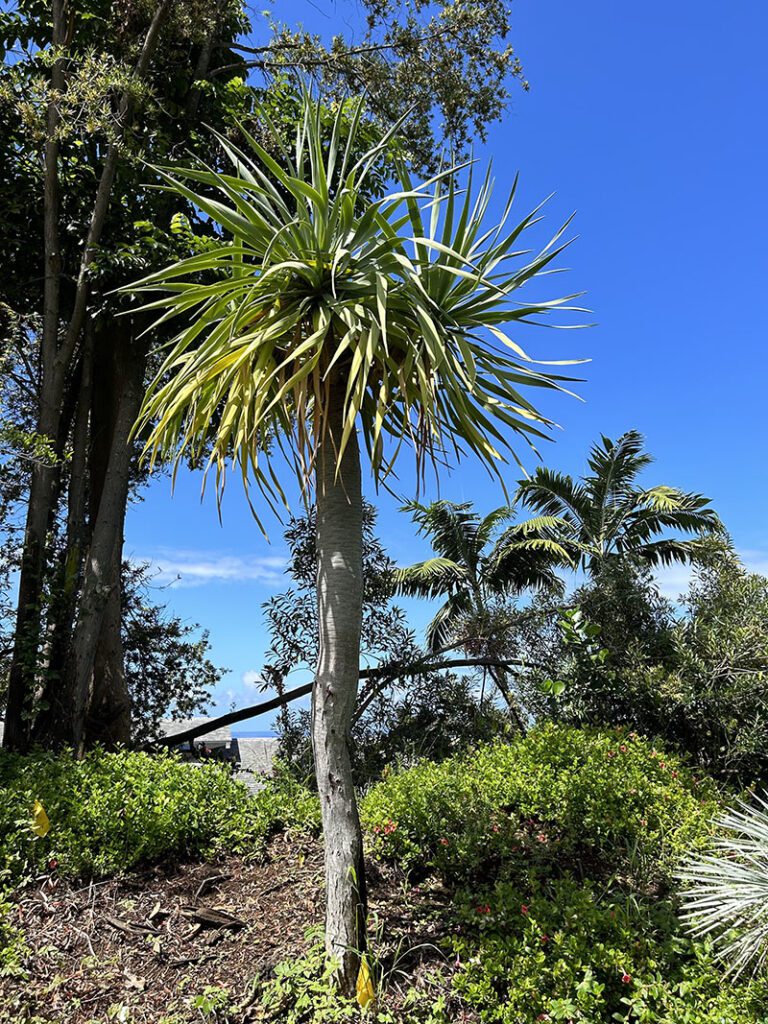 Evergreen, long-lived tree up to 50 feet in height and 16 feet circumference. Single stem while young. At around 12 years the stem stops growing, producing a flower spike that develops into a crown of terminal buds that begin branching. Each branch grows about 12 years and creates new branches. When cut or damaged, tree can ooze a red tinged resin called Dragon’s blood.